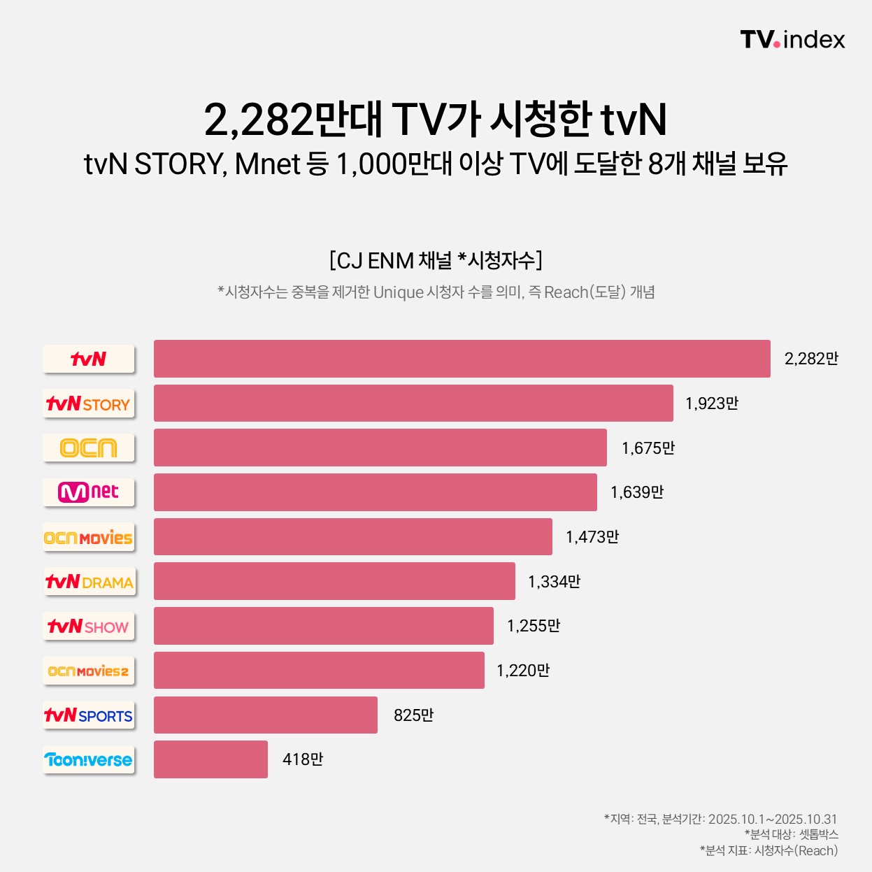 먼저 대표 채널인 tvN은 2025년 10월 한 달 동안 2,282만 대의 TV에서 시청되었습니다. 이는 국내 TV 시장에서 압도적인 도달력을 보여주는 수치입니다.